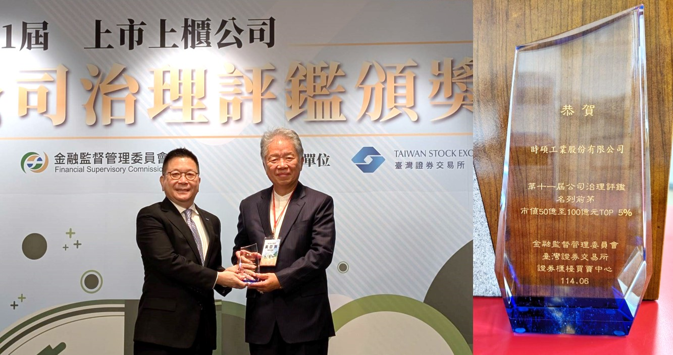 第十一届公司治理评鉴,共有976家上市公司及778家上柜公司参与评鉴,总计1,754家。其中,时硕工业获评6~20%的级距,较去年跃升一级,并在「市值50亿元以上至100亿元类」中获得前5%的优异成绩,荣获颁奖以示鼓励。这一双重肯定彰显了时硕在强化董事会职能、提升信息透明度、保障股东权益及推动永续发展等方面的积极努力与长期成果。